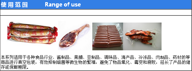 該機適 用如:肉類加工、醬腌產品、水產、海產品加工、蔬菜加工、農副產品加工、果脯、糧食、豆制品、藥材、電器、化學制品等顆粒、粉狀、液體等食品進行真空后充惰性氣體包裝、可以防止產品氧化霉變、腐敗、防潮達到延長產品的儲存期限。